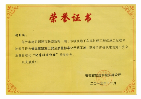 热烈祝贺我公司承建的铜陵市联盟新苑一期3号楼及地下车库扩建工程获得“省级建筑施工安全质量标准化示范工地”荣誉称号,项目经理胡东风同志获得省级“优秀项目经理”荣誉称号。望获得荣誉的项目部和个人,珍惜荣誉,再接再厉,发挥示范和带头作用,为全面提高我公司建筑施工安全质量标准化水平做出更大的贡献。