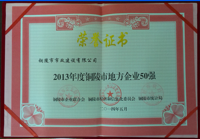 2014年5月13日下午在铜陵市铜雀台大酒店二楼开元厅召开“2013年度铜陵市企业50强发布会”,我公司等50家企业上榜。副市长黄化锋,老干部、市企业联合会会长唐世定等出席,并为50强企业颁奖。