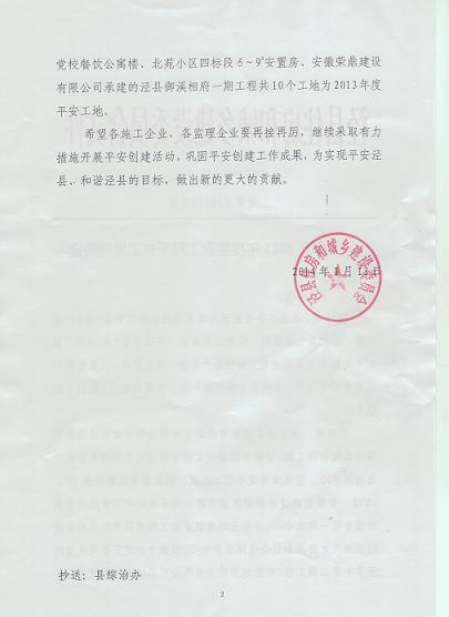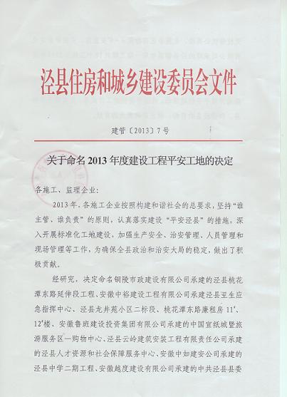 经泾县住房和城乡建设委员会评选,我公司承建的泾县桃花潭东路延伸段工程被评选为“2013年度建设工程平安工地”荣誉称号。