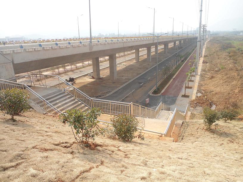 道路主线四幅板块布设,分设机动车道、非机动车道、人行道,机动车道和非机动车道设置沥青面层。雨水、污水分流排放,自来水、高压供电、通信管道、燃气管线、交通安全设施和绿化工程配套齐全。
