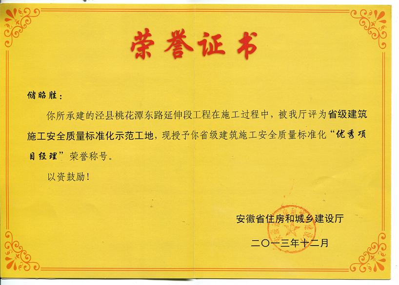 该工程取得良好赞誉和社会反响的根本是工程优良的内在质量和优美的外观视觉。项目部坚持“质量取胜,质量是生命”的原则,严抓细管,取得满意的质量效果。工程交工验收主要指标数据达到或超过规范要求,一次性通过竣工验收,内业资料一次性验收合格。施工过程中被安徽省住房和城乡建设厅授予“省级建筑工地安全质量标准化示范工地”光荣称号,公司将按照相关条件积极申报宣城市优质工程奖“云岭杯”和安徽省优质工程奖“黄山杯”。