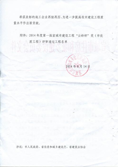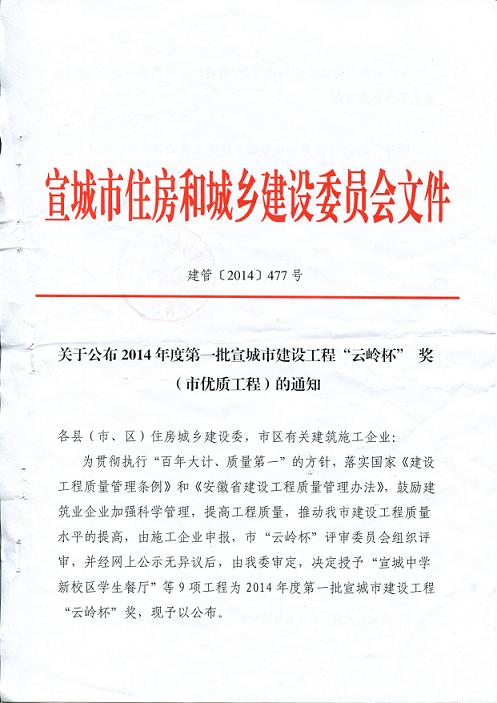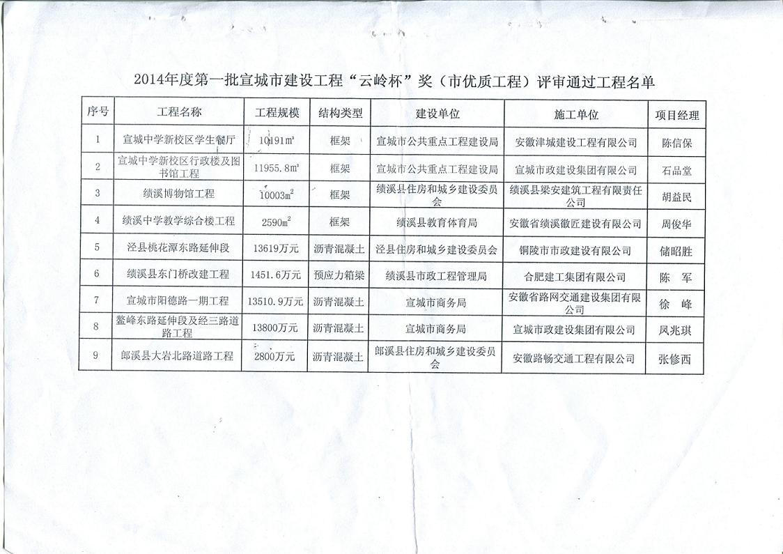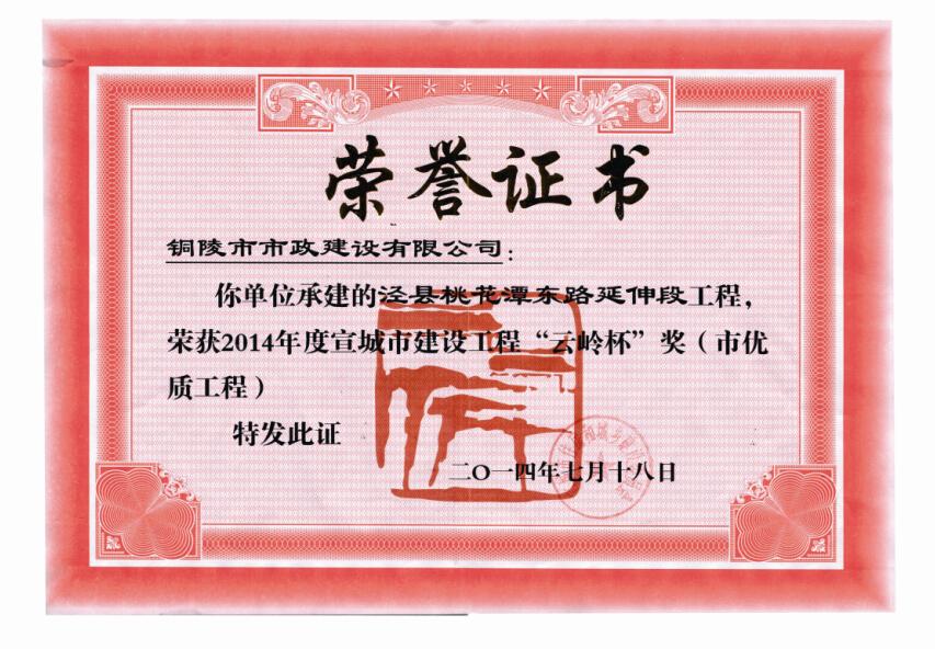 热烈祝贺我公司承建的宣城市泾县桃花潭东路延伸段工程继获得“省级建筑施工安全质量标准化示范工地”后,再次荣获2014年度宣城市建设工程“云岭杯”奖(市优质工程)。