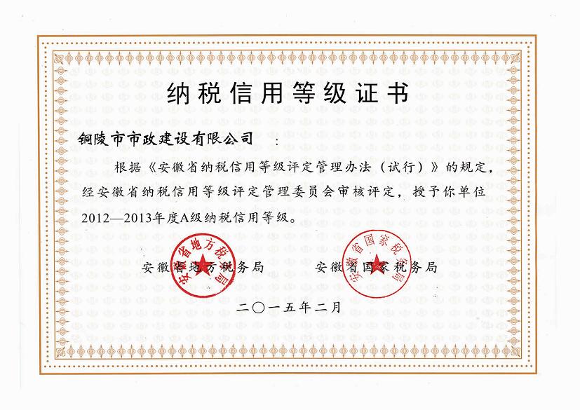 本月铜陵市市政建设有限公司在安徽省地税局开展的纳税信用等级评定工作中被评定为“2012-2013年度纳税信用等级A级”信用单位,被安徽省地方税务局授予“纳税信用等级A级纳税人”称号。