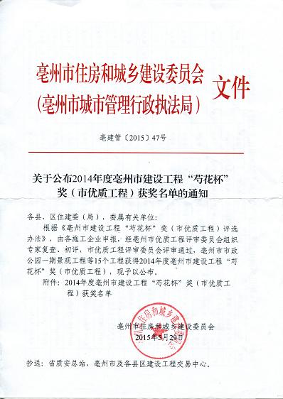 公司承建的蒙城县城南新区西片及开发区南片区道排工程二标段工程荣获“2014年亳州市建设工程芍花杯奖”