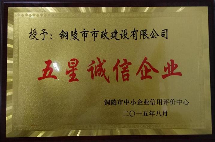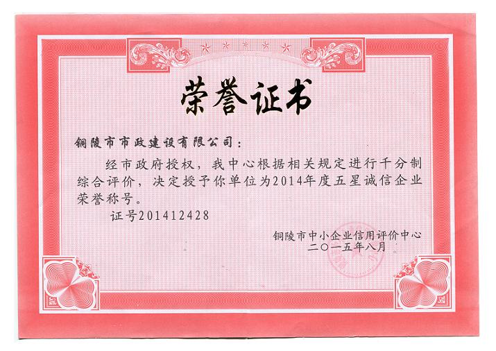 热烈祝贺我公司被铜陵市中小企业信用评价中心评为2014年度“五星诚信企业”荣誉称号。
