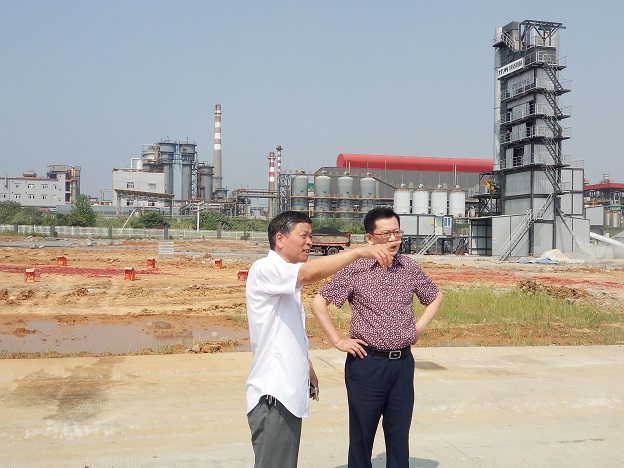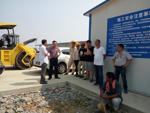 沥青拌合站负责人郑铜明(右二)在向董事长李威(右一)介绍项目进展情况 图(1)