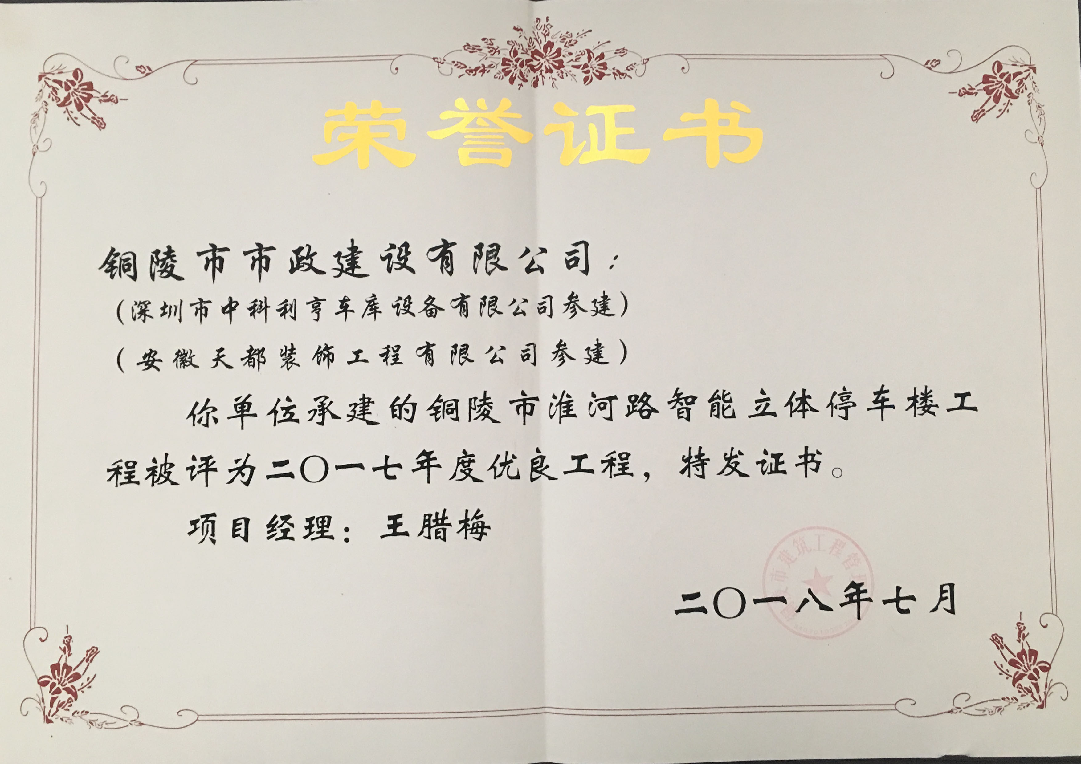 热烈祝贺我公司荣获2017年度铜陵市建设工程质量“铜都杯”奖项(铜陵市淮河路智能立体停车楼),2017年度铜陵市“优良工程”(铜陵市淮河路智能立体停车楼)。